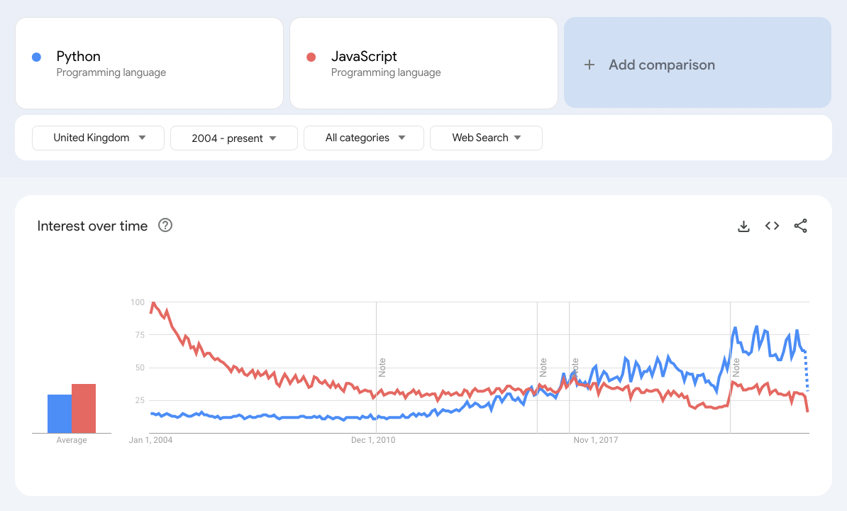 A quick look at Google search trends shows that JavaScript’s popularity as a search term has consistently dropped over the past 20 years, while Python has trended in reverse.