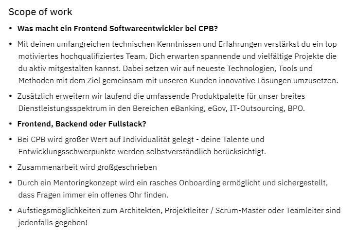 Mitarbeitervorteile werden im Normalfall auf jedem Stelleninserat beinahe ident sein, während die Tätigkeitsbeschreibung und die Rolle dieser Position im Unternehmen sich von Inserat zu Inserat unterscheiden soll.