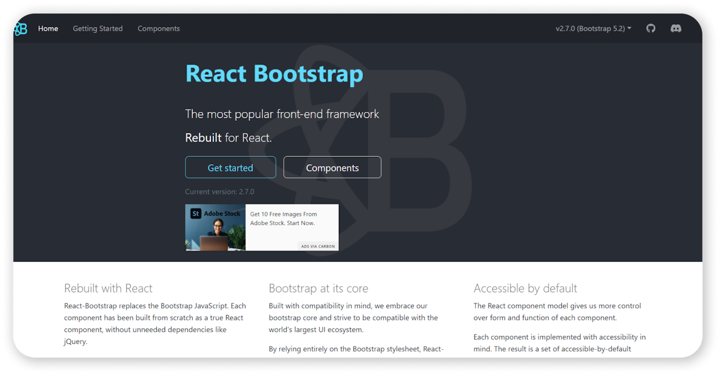 React Bootstrap is the rebuilt version of the popular frontend CSS framework for React. Each component of the React Bootstrap is built from scratch with no unneeded dependencies and is accessible by default.