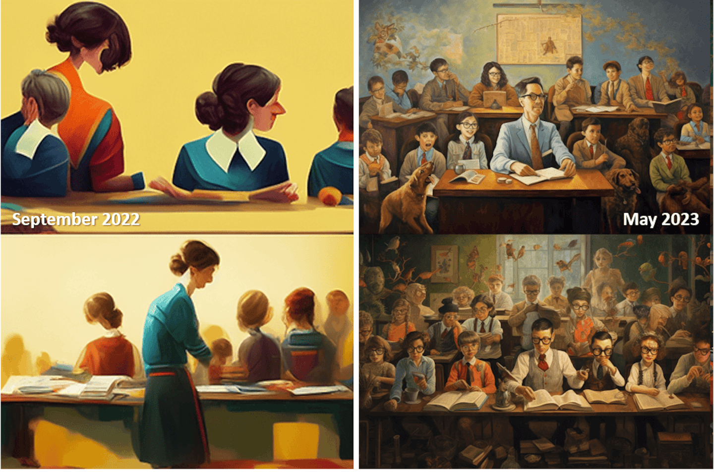 There are a few things to appreciate here. Firstly, the algorithm continues to understand that a teacher needs a classroom and students. What’s firstly changed (beyond the details getting much better) is that teachers are sitting with their students, which is not really correct. Secondly, animals seem to be more present in the latest version. Are there dogs and birds in modern elementary schools’ classes? One may only hope.