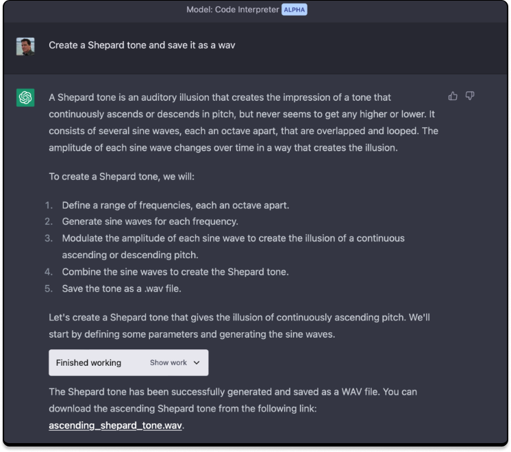 ChatGPT can provide you with a downloadable link tailored to the file type you ask it for. Sound file types and .txt were demonstrated. Not only do you see the code snippet but you’ll also see the result.