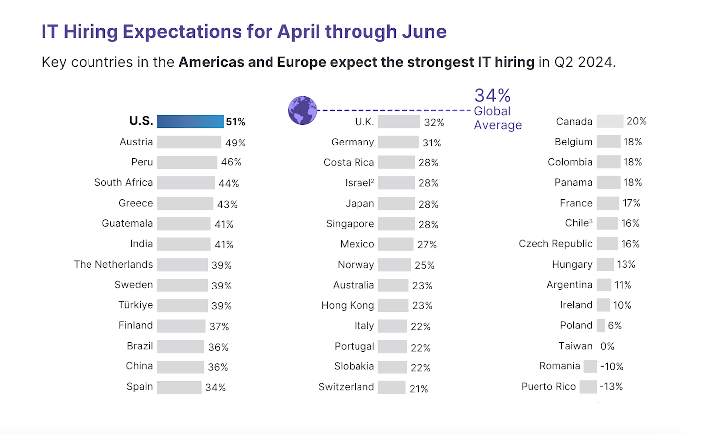 The US leads the global economy in expected IT hirings from April to June 2024.