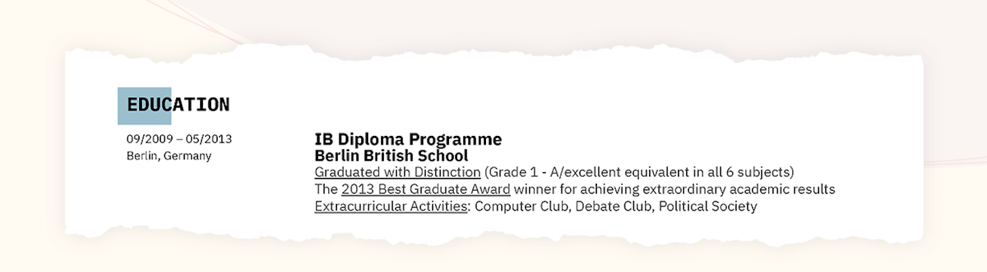 - Hobbies: Try to add hobbies that are unique and interesting. Bonus points if they align with the company's work culture.